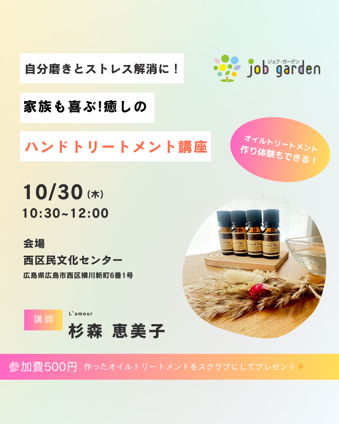 ※参加費500円 ※当日はひじが出せる服装でお越しください ジョブガーデン電話番号 ☎0822361821